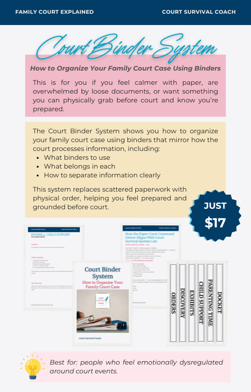 The Court Binder System is a step-by-step physical organization framework designed specifically for active or ongoing family court matters.